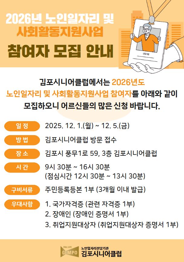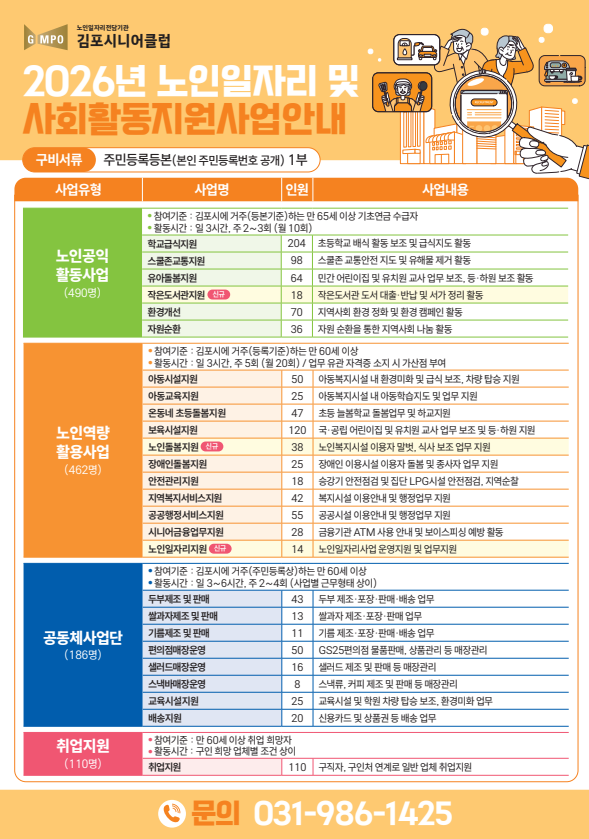 김포시니어클럽에서 2026년 노인일자리 및 사회활동지원사업 참여자분들을 모집합니다.